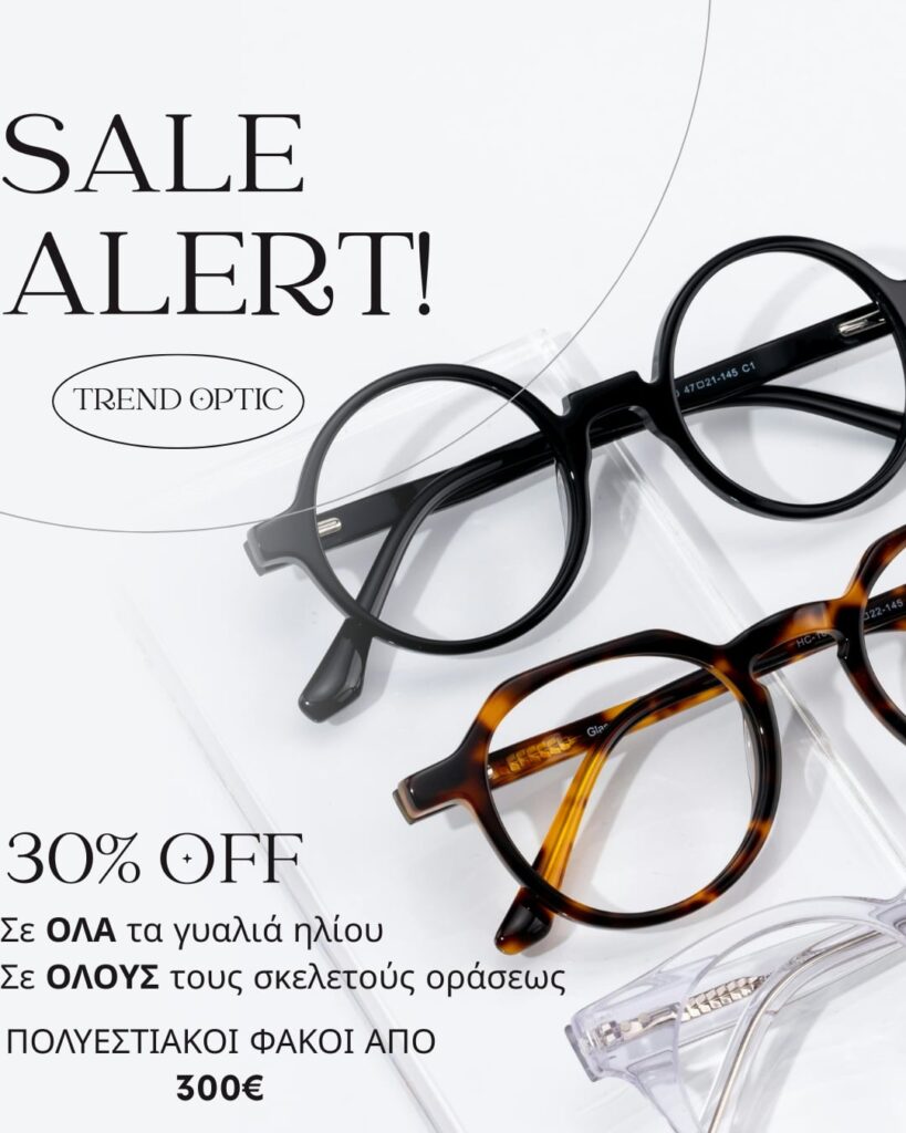 Από σήμερα και για 10 ημέρες θα βρείτε όλα τα γυαλιά ηλίου και τα σκελετά οράσεως με 30% έκπτωση, καθώς και πολυεστιακούς οργανικούς φακούς από 300€!!!