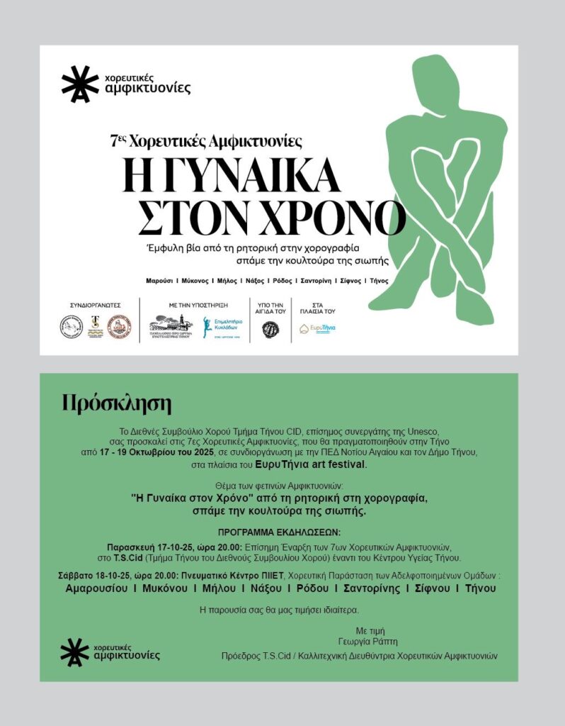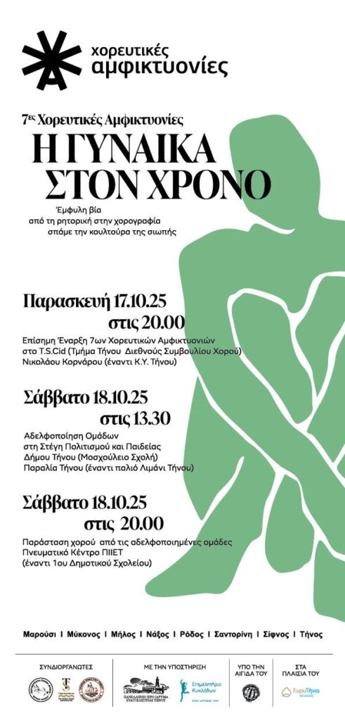 Από τις 17 έως τις 19 Οκτωβρίου 2025, η Τήνος αναδεικνύεται ξανά ως τόπος καλλιτεχνικού διαλόγου, έκφρασης και ενδυνάμωσης. Στην καρδιά του Αιγαίου, εκεί όπου η παράδοση συναντά τη σύγχρονη δημιουργία, οι Χορευτικές Αμφικτυονίες, που πραγματοποιούνται στα πλαίσια του ΕυρυΤήνια Art Festival,  συγκροτούν  μια κοινότητα ανθρώπων της τέχνης και της παιδείας, με στόχο έναν πιο ανοιχτό και συνειδητό κόσμο.