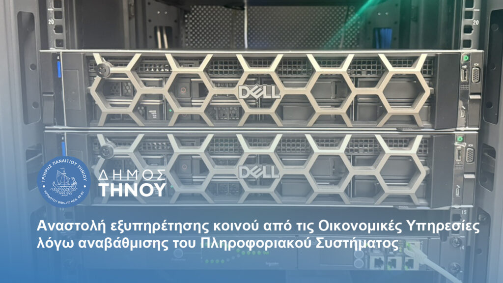 O Δήμος Τήνου ενημερώνει ότι από Πέμπτη 13 Νοεμβρίου 2025, στις 12:00, έως και Δευτέρα 24 Νοεμβρίου 2025, στις 15:00, οι Οικονομικές Υπηρεσίες δεν θα εξυπηρετούν το κοινό, λόγω αναβάθμισης του Πληροφοριακού Συστήματος στο Δήμο μας.