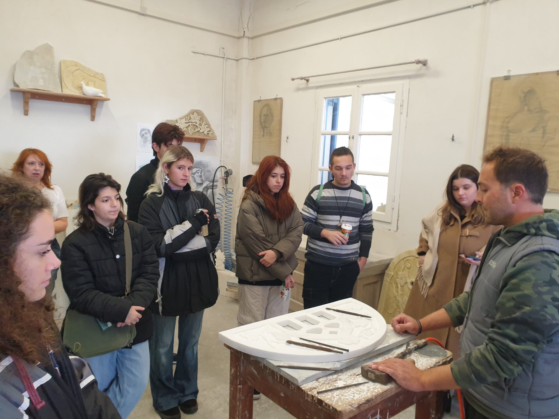Υπεύθυνοι υλοποίησης εργαστηριακών μαθημάτων του 1ου Εργαστηριακού Κέντρου Β΄ Αθήνας- Αγίας Παρασκευής: Γιώργος Μποχτανίδης (συντονιστής εκπαιδευτικός), Χαρίκλεια Τσιώνη (συμμετέχουσα εκπαιδευτικός) και Ρωσάννα Τίκα (μαρμαρογλύπτρια).