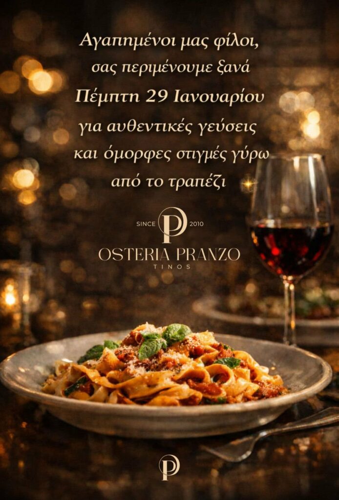 Η Osteria Pranzo Tinos ανοίγει ξανά τις πόρτες της την Πέμπτη 29 Ιανουαρίου και σας υποδέχεται για ακόμη μια φορά σε ένα ζεστό, ατμοσφαιρικό περιβάλλον, γεμάτο αυθεντικές ιταλικές γεύσεις και όμορφες στιγμές γύρω από το τραπέζι.
