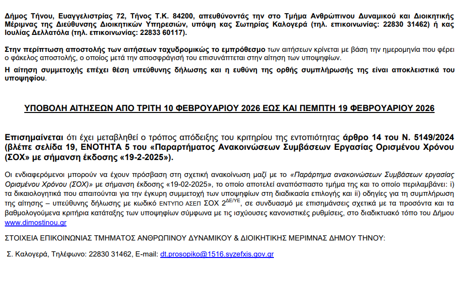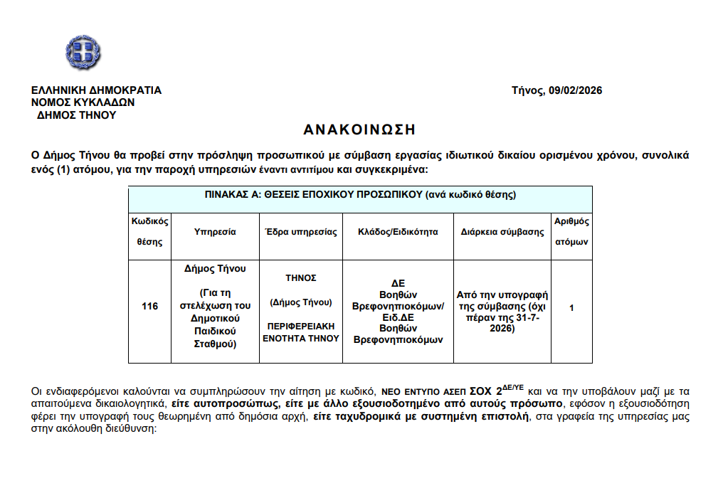 Ο Δήμος Τήνου θα προβεί στην πρόσληψη προσωπικού με σύμβαση εργασίας ιδιωτικού δικαίου ορισμένους χρόνου, συνολικά ενός (1) ατόμου για την θέση Βοηθού Βρεφονηπιοκόμου Ειδ.ΔΕ Βοηθών Βρεφονηπιοκόμων.