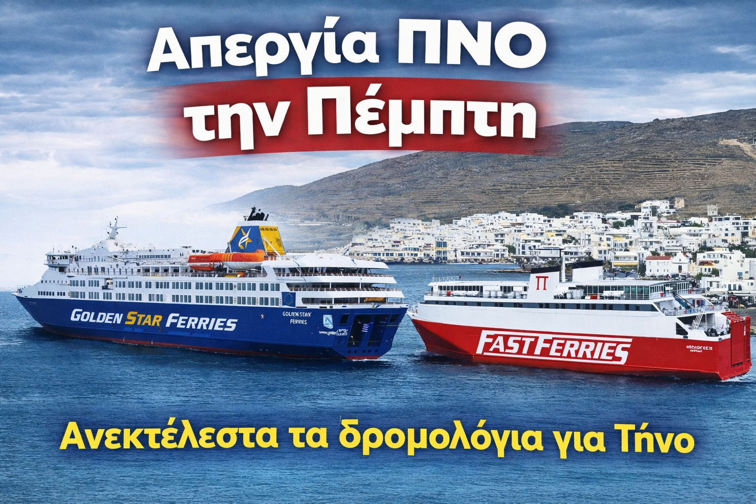 Σας ενημερώνουμε ότι λόγω της 24ωρης απεργίας της Π.Ν.Ο. την Πέμπτη 05/03/2026, τα δρομολόγια των πλοίων μας θα διαμορφωθούν, ως ακολούθως :