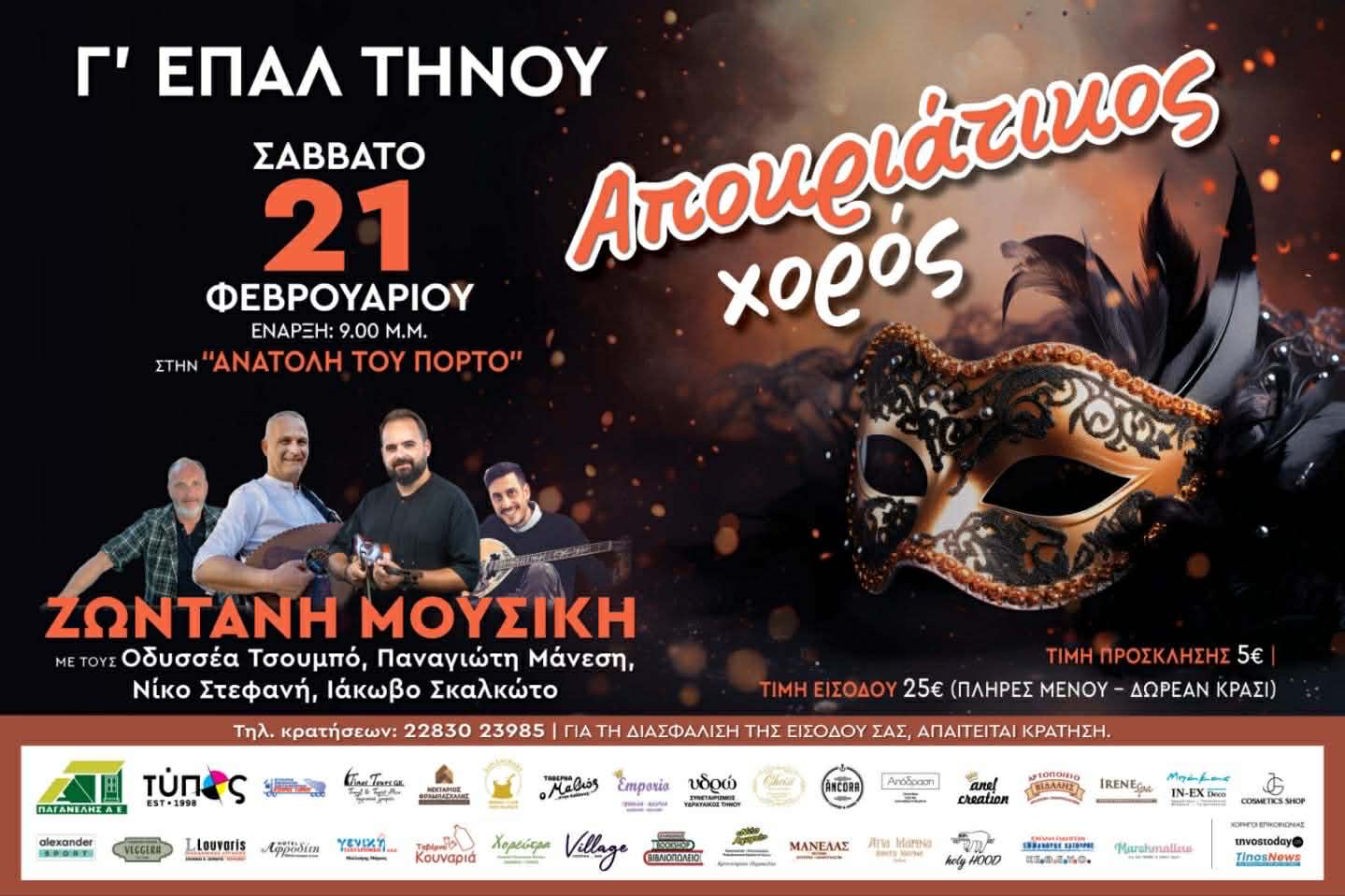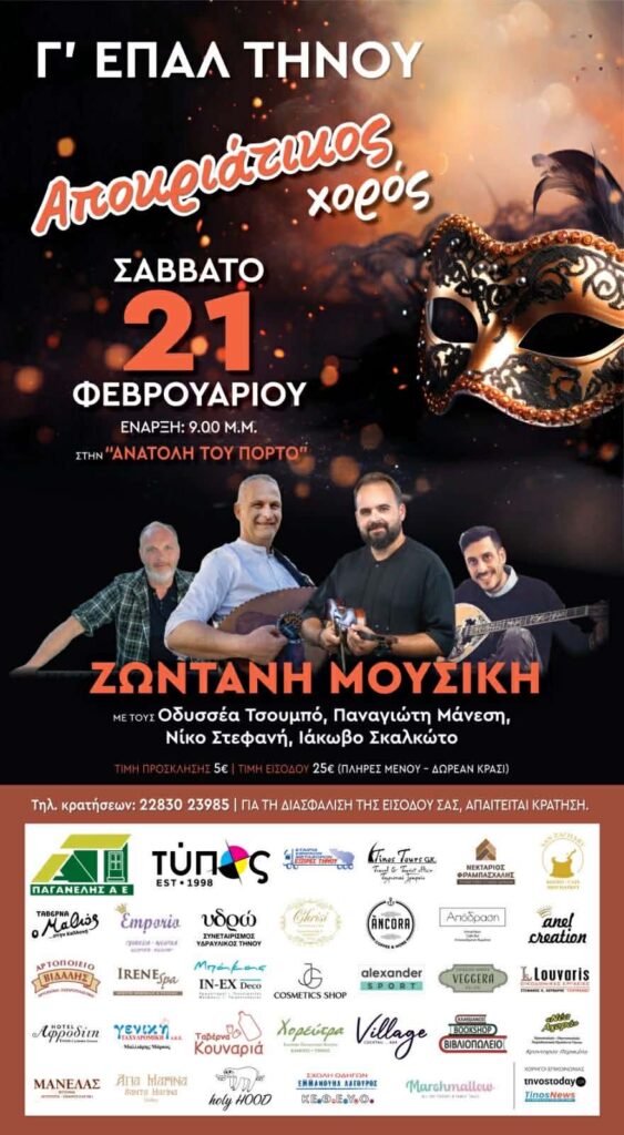 Η Γ΄τάξη του ΕΠΑΛ Τήνου σας προσκαλεί το Σάββατο, 21 Φεβρουαρίου στο τραπέζι που διοργανώνει στην Ανατολή του Πόρτο και ώρα έναρξης 21.00. Ζωντανή ορχήστρα με τους Οδυσσέα Τσουμπό, Παναγιώτη Μάνεση, Νίκο Στεφανή και Ιάκωβο Σκλακώτο.