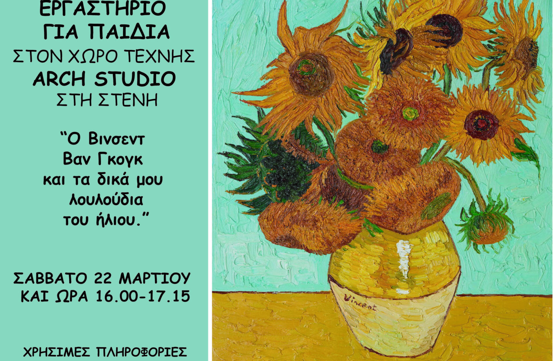 Η άνοιξη εχει μπει για τα καλά και ο χώρος τέχνης Arch studio στη Στενή την καλωσορίζει με ένα ανοιξιάτικο εικαστικό εργαστήριο αφιερωμένο στα ηλιοτρόπια του Βίνσεντ Βαν Γκογκ.