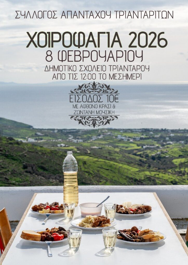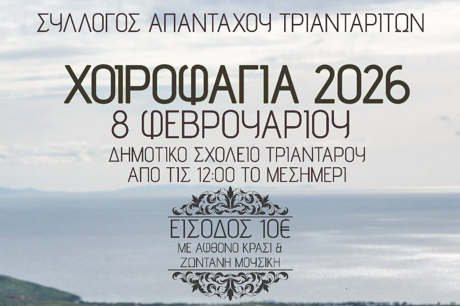 Ο Σύλλογος Απανταχού Τριανταριτών σας προσκαλεί στη Χοιροφαγία 2026, την Κυριακή 8 Φεβρουαρίου, στο Δημοτικό Σχολείο Τριαντάρου, από τις 12:00 το μεσημέρι. Φαγητό όπως πρέπει, άφθονο κρασί, ζωντανή μουσική, και ό,τι άλλο χρειάζεται για να θυμηθούμε γιατί αυτές οι μέρες δεν χάνονται.