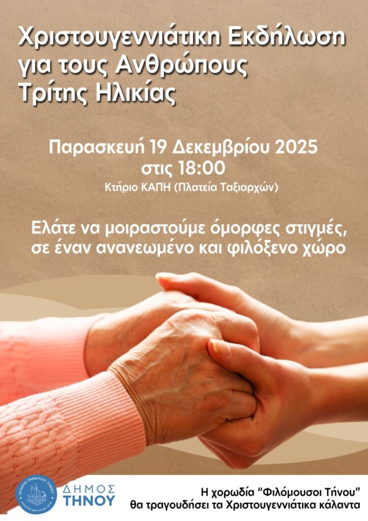 Ο Δήμος Τήνου σας προσκαλεί την Παρασκευή 19 Δεκεμβρίου 2025 και ώρα 18:00 σε χριστουγεννιάτικη εκδήλωση στον ανακαινισμένο χώρο των ΚΑΠΗ Τήνου (Πλατεία Ταξιαρχών).