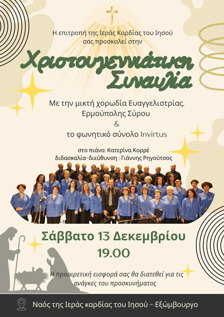 Ελάτε να ζήσουμε μαζί το πνεύμα των Χριστουγέννων, με αγαπημένες μελωδίες από την μικτή χορωδία Ευαγγελιστριας, Ερμούπολης Συρου & το φωνητικό σύνολο Invirtus που θα μας βάλουν όλους στο κλίμα των γιορτών.