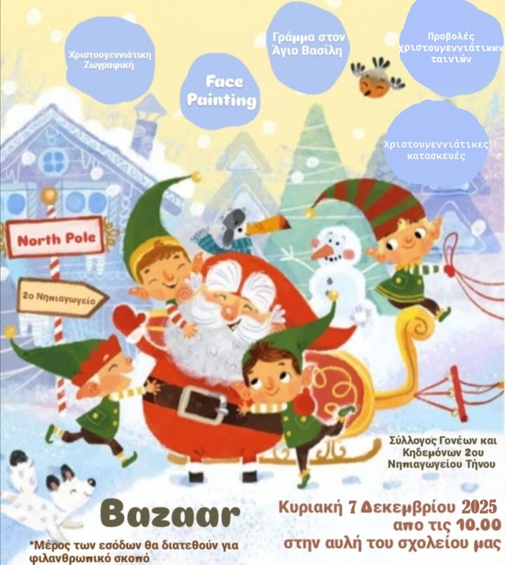Θα μας περιμένουν να διασκεδάσουμε όλοι μαζί στο χριστουγεννιάτικο🎄bazaar στην αυλή του 2ου Νηπιαγωγείου Τήνου την Κυριακή 7 Δεκεμβρίου από τις 10:00 το πρωί.