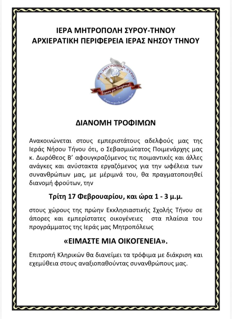 Ανακοινώνεται στους εμπεριστάτους αδελφούς μας της Ιεράς Νήσου Τήνου ότι, ο Σεβασμιώτατος Ποιμενάρχης μας κ. Δωρόθεος Β’ αφουγκραζόμενος τις ποιμαντικές και άλλες ανάγκες και ανύστακτα εργαζόμενος για την ωφέλεια των συνανθρώπων μας, με μέριμνά του, θα πραγματοποιηθεί διανομη φρούτων, την
