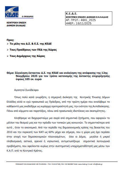 Ακολουθεί το έγγραφο του προέδρου της Κεντρικής Ένωσης Δήμων Ελλάδος