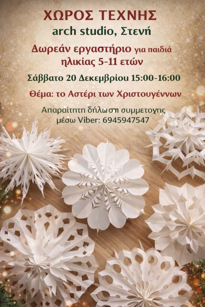 Ο χώρος τέχνης Arch Studio πραγματοποίησε σήμερα δωρεάν χριστουγεννιάτικο εργαστήριο δημιουργικής κατασκευής για τα παιδιά του Νηπιαγωγείου Στενής, προσφέροντας μια βιωματική εμπειρία επαφής με την τέχνη.