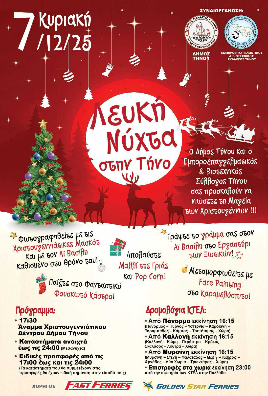 Σε Χριστουγεννιάτικους ρυθμούς μπαίνει η Τήνο. Την Κυριακή, έχουμε το Άναμμα του Χριστουγεννιάτικου Δέντρου (17.30) και τη Λευκή Νύχτα με πολλές δραστηριότητες για τους μικρούς μας φίλους, μια συνδιοργάνωση του Δήμου Τήνου και του Εμποροεπαγγελματικού Συλλόγου του νησιού.