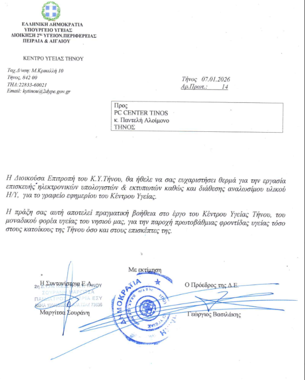 Η Διοικούσα Επιτροπή του Κ.Υ. Τήνου, θα ήθελε να σας ευχαριστήσει θερμά για την εργασία επισκευής ηλεκτρονικών υπολογιστών & εκτυπωτών καθώς και διάθεσης αναλωσίμου υλικού Η/Υ, για το γραφείο εφημερίου του Κέντρου Υγείας.