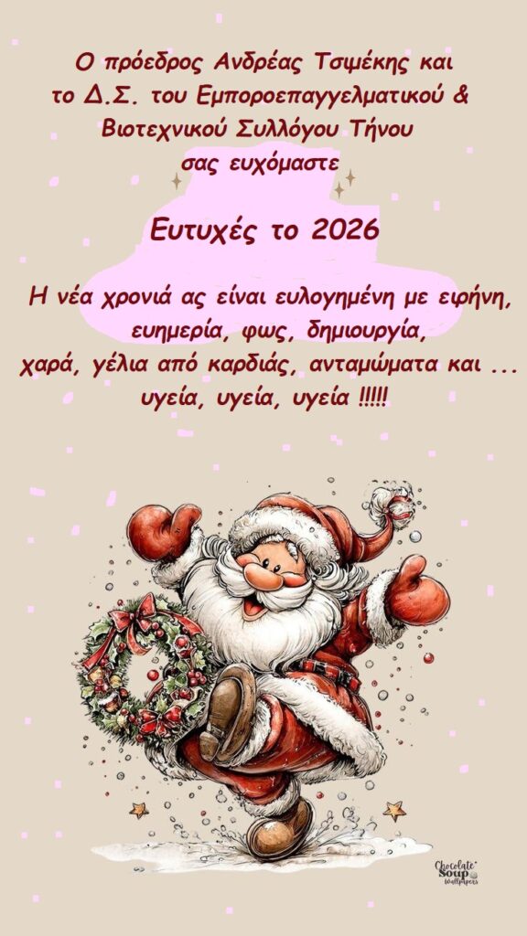 Ο πρόεδρος Ανδρέας Τσιμέκης και το Διοικητικό Συμβούλιο του Εμποροεπαγγελματικού και Βιοτεχνικού Συλλόγου Τήνου σας ευχόμαστε Ευτυχές το 2026