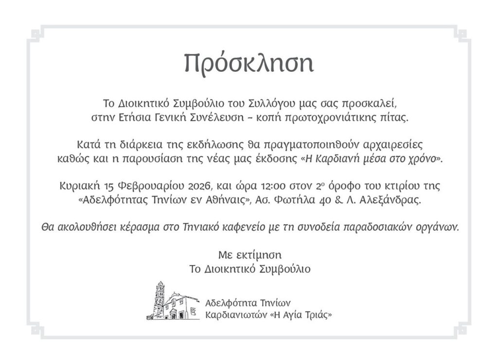 Κυριακή 15 Φεβρουαρίου 2026, και ώρα 12:00 στον 2ο όροφο του κτιρίου της «Αδελφότητας Τηνίων εν Αθήναις», Ασ. Φωτήλα 40 & Λ. Αλεξάνδρας.