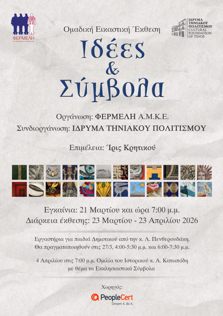 Η Πολιτιστική Εταιρεία ΦΕΡΜΕΛΗ (phermeli.gr), στο πλαίσιο της δράσης της για τη διαφύλαξη και την προβολή της ιστορικής μνήμης και της ελληνικής πολιτισμικής κληρονομιάς, συνεργάζεται με το Ίδρυμα Τηνιακού Πολιτισμού για την παρουσίαση της ομαδικής εικαστικής έκθεσης «Ιδέες & Σύμβολα», η οποία θα φιλοξενηθεί στο Μέγαρο του Ιδρύματος στην Τήνο από τις 23 Μαρτίου έως τις 23 Απριλίου 2026.
