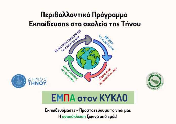 Με αφορμή την Ευρωπαϊκή Εβδομάδα Μείωσης Αποβλήτων (EWWR 2025), η Κοιν.Σ.Επ. Καλλονή–Κελλιά, με την υποστήριξη του Δήμου Τήνου, υλοποιεί το περιβαλλοντικό πρόγραμμα Κυκλικής Οικονομίας «ΕΜΠΑ στον ΚΥΚΛΟ» σε σχολεία Πρωτοβάθμιας και Δευτεροβάθμιας Εκπαίδευσης του νησιού.