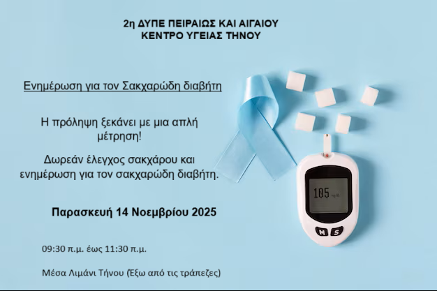 Με αφορμή την Παγκόσμια ημέρα Σακχαρώδη Διαβήτη, το Κέντρο Υγείας Τήνου διοργανώνει την Παρασκευή 14 Νοέμβριου 2025 στο Μέσα Λιμάνι (μπροστά στις τράπεζες) δράση ενημέρωσης και δωρεάν μετρήσεις σακχάρου για όλους τους πολίτες.