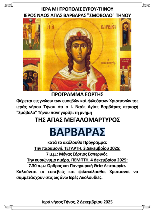 Φέρεται εις γνώσιν των ευσεβών καί φιλεόρτων Χριστιανών της ιεράς νήσου Τήνου ότι ο Ι. Ναός Αγίας Βαρβάρας περιοχή “Σμόβολο” Τήνου πανηγυρίζει τη μνήμη ΤΗΣ ΑΓΙΑΣ ΜΕΓΑΛΟΜΑΡΤΥΡΟΣ ΒΑΡΒΑΡΑΣ κατά το ακόλουθο Πρόγραμμα: