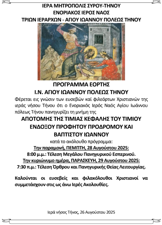 Φέρεται εις γνώσιν των ευλαβών καί φιλεόρτων Χριστιανών της ιεράς νήσου Τήνου ότι ο Ενοριακός Ι. Ναός Αγίου Ιωάννου πόλεως Τήνου πανηγυρίζει τήν εορτή της ΑΠΟΤΟΜΗΣ ΤΗΣ ΤΙΜΙΑΣ ΚΕΦΑΛΗΣ ΤΟΥ ΤΙΜΙΟΥ ΕΝΔΟΞΟΥ ΠΡΟΦΗΤΟΥ ΠΡΟΔΡΟΜΟΥ ΚΑΙ ΒΑΠΤΙΣΤΟΥ ΙΩΑΝΝΟΥ