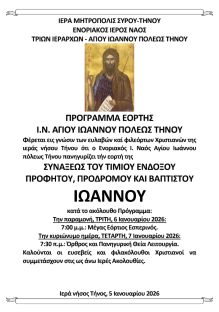 Φέρεται εις γνώσιν των ευλαβών καί φιλεόρτων Χριστιανών της ιεράς νήσου Τήνου ότι ο Ενοριακός Ι. Ναός Αγίου Ιωάννου πόλεως Τήνου πανηγυρίζει τήν εορτή της ΣΥΝΑΞΕΩΣ ΤΟΥ ΤΙΜΙΟΥ ΕΝΔΟΞΟΥ