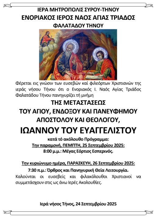 Φέρεται εις γνώσιν των ευσεβών καί φιλεόρτων Χριστιανών της ιεράς νήσου Τήνου ότι ο Ενοριακός Ι. Ναός Αγίας Τριάδος Φαλατάδου Τήνου πανηγυρίζει τή μνήμη ΤΗΣ ΜΕΤΑΣΤΑΣΕΩΣ ΤΟΥ ΑΓΙΟΥ, ΕΝΔΟΞΟΥ ΚΑΙ ΠΑΝΕΥΦΗΜΟΥ ΑΠΟΣΤΟΛΟΥ ΚΑΙ ΘΕΟΛΟΓΟΥ, ΙΩΑΝΝΟΥ ΤΟΥ ΕΥΑΓΓΕΛΙΣΤΟΥ κατά τό ακόλουθο Πρόγραμμα: