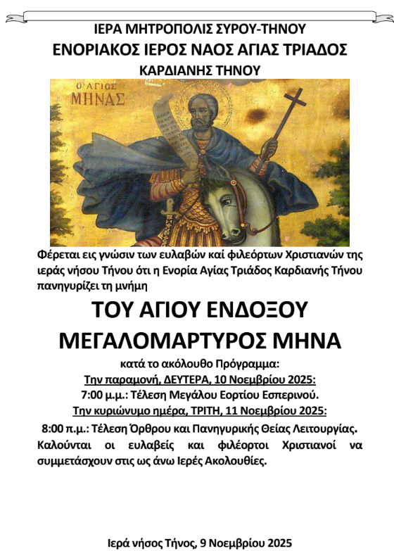 Φέρεται εις γνώσιν των ευλαβών καί φιλεόρτων Χριστιανών της ιεράς νήσου Τήνου ότι η Ενορία Αγίας Τριάδος Καρδιανής Τήνου πανηγυρίζει τη μνήμη ΤΟΥ ΑΓΙΟΥ ΕΝΔΟΞΟΥ ΜΕΓΑΛΟΜΑΡΤΥΡΟΣ ΜΗΝΑ κατά το ακόλουθο Πρόγραμμα: