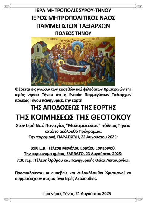 Φέρεται εις γνώσιν των ευσεβών καί φιλεόρτων Χριστιανών της ιεράς νήσου Τήνου ότι η Ενορία Παμμεγίστων Ταξιαρχών πόλεως Τήνου πανηγυρίζει την εορτή ΤΗΣ ΑΠΟΔΟΣΕΩΣ ΤΗΣ ΕΟΡΤΗΣ ΤΗΣ ΚΟΙΜΗΣΕΩΣ ΤΗΣ ΘΕΟΤΟΚΟΥ Στον Ιερό Ναό Παναγίας “Μαλαματένιας” πόλεως Τήνου κατά το ακόλουθο Πρόγραμμα: