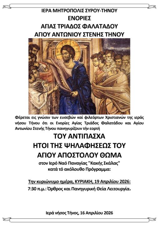 Φέρεται εις γνώσιν των ευσεβών καί φιλεόρτων Χριστιανών της ιεράς νήσου Τήνου ότι οι Ενορίες Αγίας Τριάδος Φαλατάδου και Αγίου Αντωνίου Στενής Τήνου πανηγυρίζουν τήν εορτή ΤΟΥ ΑΝΤΙΠΑΣΧΑ ΗΤΟΙ ΤΗΣ ΨΗΛΑΦΗΣΕΩΣ ΤΟΥ ΑΓΙΟΥ ΑΠΟΣΤΟΛΟΥ ΘΩΜΑ στον Ιερό Ναό Παναγίας “Κακής Σκάλας” κατά τό ακόλουθο Πρόγραμμα: