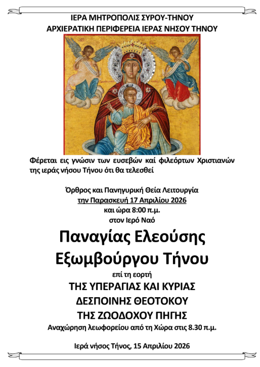 Φέρεται εις γνώσιν των ευσεβών καί φιλεόρτων Χριστιανών της ιεράς νήσου Τήνου ότι θα τελεσθεί Όρθρος και Πανηγυρική Θεία Λειτουργία την Παρασκευή 17 Απριλίου 2026 και ώρα 8:00 π.μ. στον Ιερό Ναό Παναγίας Ελεούσης Εξωμβούργου Τήνου επί τη εορτή ΤΗΣ ΥΠΕΡΑΓΙΑΣ ΚΑΙ ΚΥΡΙΑΣ ΔΕΣΠΟΙΝΗΣ ΘΕΟΤΟΚΟΥ ΤΗΣ ΖΩΟΔΟΧΟΥ ΠΗΓΗΣ