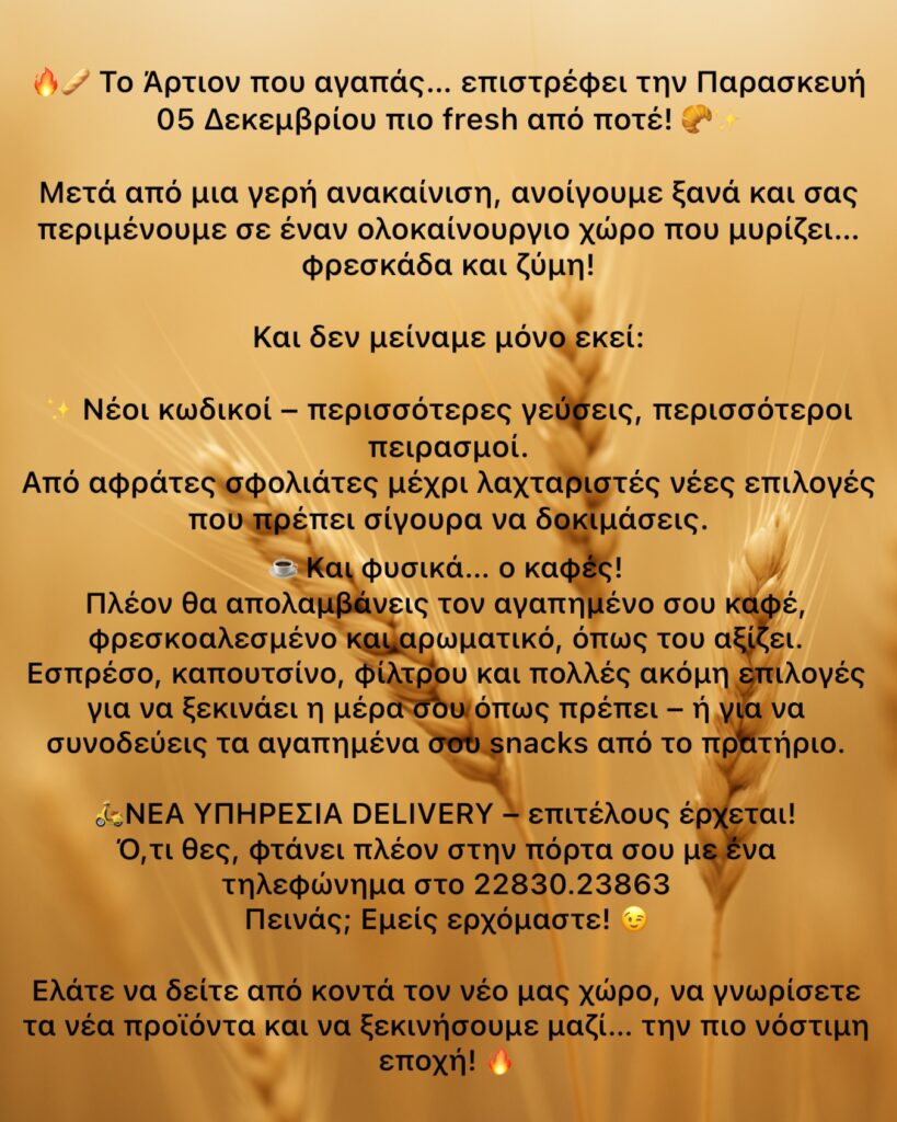 Μετά από μια γερή ανακαίνιση, ανοίγουμε ξανά και σας περιμένουμε σε έναν ολοκαίνουριο χώρο που μυρίζει… φρεσκάδα και ζύμη!
