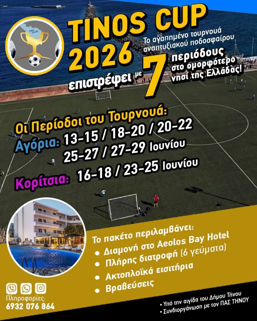 Το Tinos Cup επιστρέφει αναβαθμισμένο, φιλοδοξώντας και αυτό το καλοκαίρι να αποτελέσει μια ξεχωριστή ποδοσφαιρική και όχι μόνο εμπειρία για τους ποδοσφαιριστές & τις ποδοσφαιρίστριες που θα συμμετάσχουν!