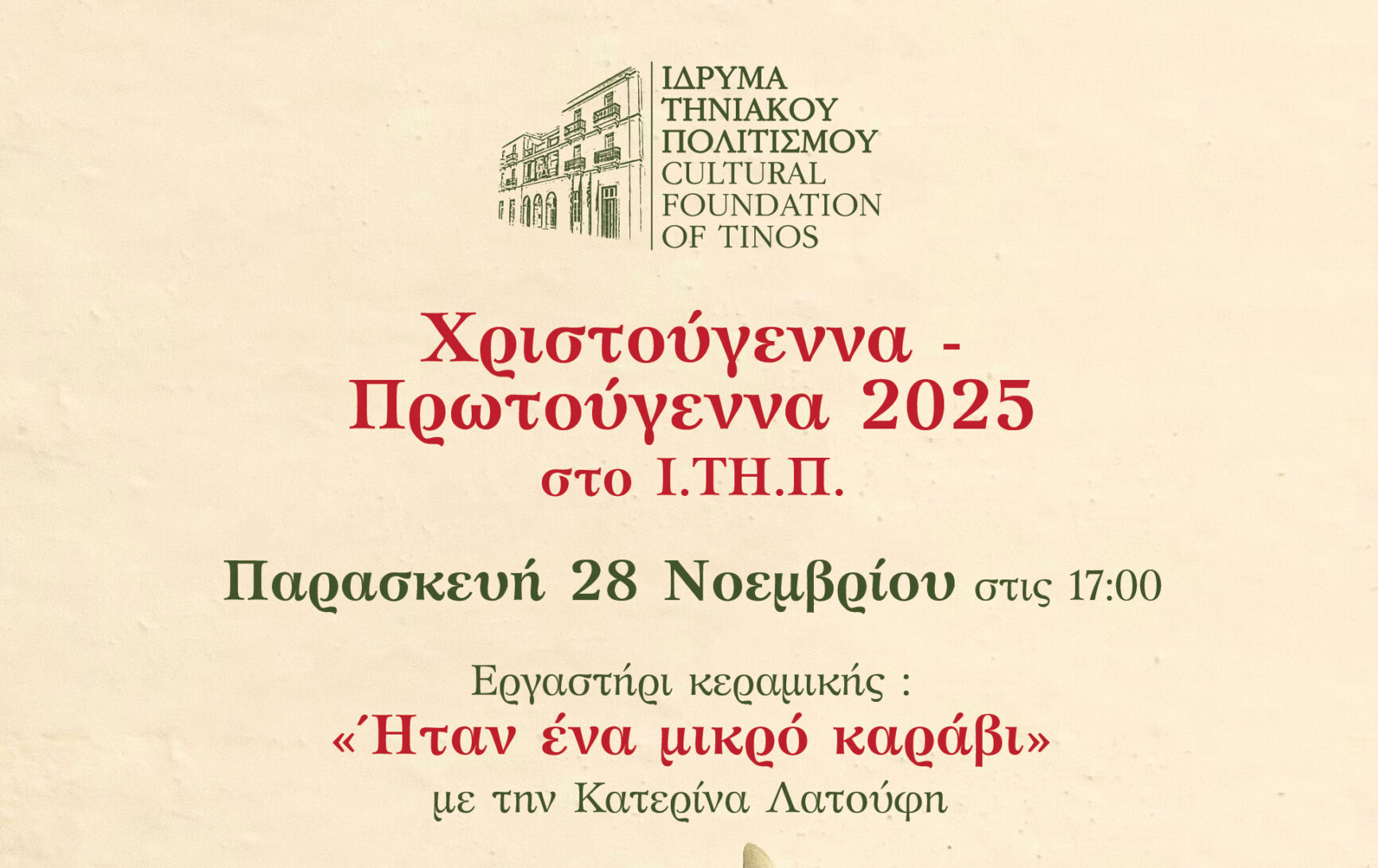 Το Διοικητικό Συμβούλιο του Ιδρύματος Τηνιακού Πολιτισμού προσκαλεί παιδιά Δημοτικού στο γιορτινό εργαστήρι κεραμικής «Ήταν ένα μικρό καράβι», που θα πραγματοποιηθεί την Παρασκευή 28 Νοεμβρίου 2025.