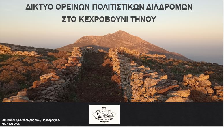 Υπενθυμίζεται ότι η Εταιρεία Τηνιακών Μελετών έχει ξεκινήσει την υλοποίηση της δράσης για δημιουργία και ανάδειξη δικτύου πολιτιστικών διαδρομών στο Κεχροβούνι, με επιχορήγηση και αιγίδα του Υπουργείου Πολιτισμού και με την υποστήριξη του Δήμου Τήνου.