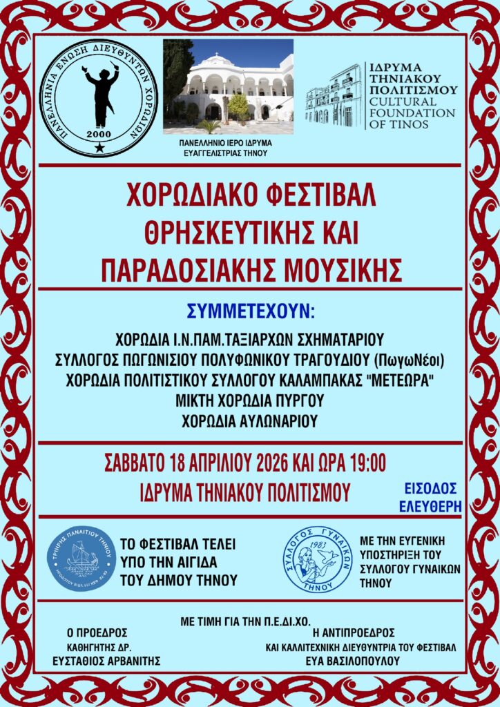 Το Ίδρυμα Τηνιακού Πολιτισμού έχει τη χαρά να φιλοξενεί για ακόμα μία χρονιά το Χορωδιακό Φεστιβάλ Θρησκευτικής και Παραδοσιακής Μουσικής, που διοργανώνει η Πανελλήνια Ένωση Διευθυντών Χορωδίας (Π.Ε.ΔΙ.ΧΟ), σε συνδιοργάνωση με το Πανελλήνιο Ιερό Ίδρυμα Ευαγγελιστρίας Τήνου και το Ίδρυμα Τηνιακού Πολιτισμού.