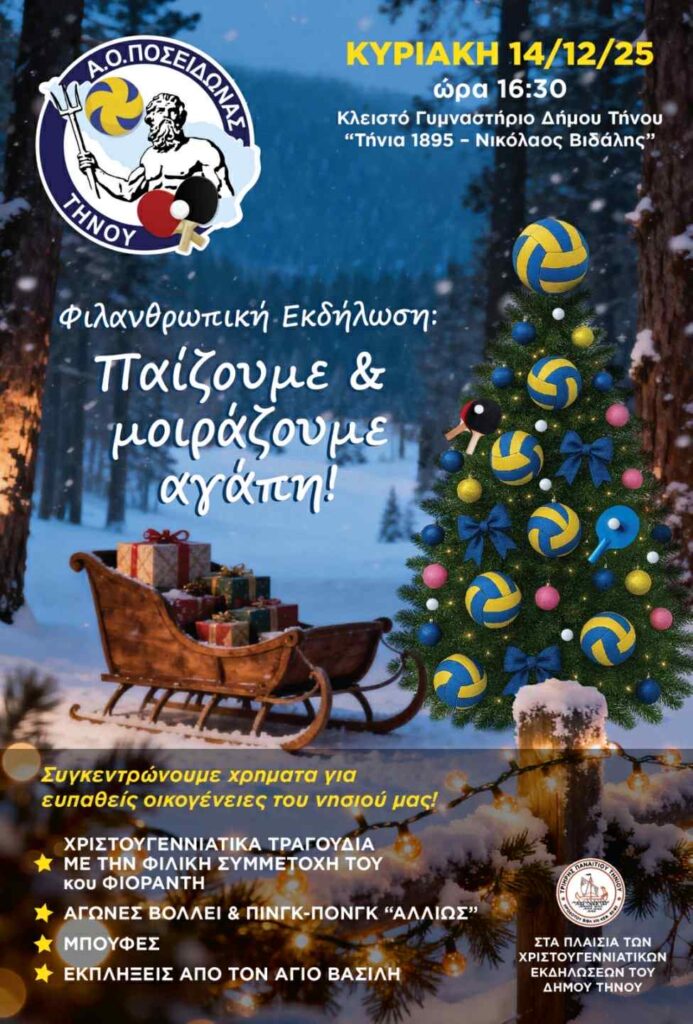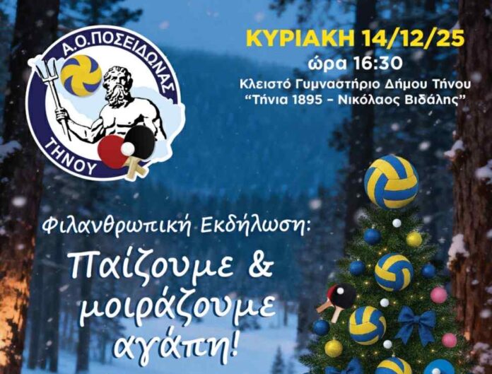 Ο Α.Ο. Ποσειδώνας Τήνου διοργανώνει μια ξεχωριστή φιλανθρωπική εκδήλωση με τίτλο «Παίζουμε & μοιράζουμε αγάπη!», την Κυριακή 14 Δεκεμβρίου 2025 στις 16:30, στο Κλειστό Γυμναστήριο Δήμου Τήνου «Τήνια 1895 – Νικόλαος Βιδάλης». Στόχος της εκδήλωσης είναι η συγκέντρωση χρημάτων για οικογένειες του νησιού που βρίσκονται σε ανάγκη, μέσα σε ένα χαρούμενο, γιορτινό και ζεστό χριστουγεννιάτικο κλίμα.