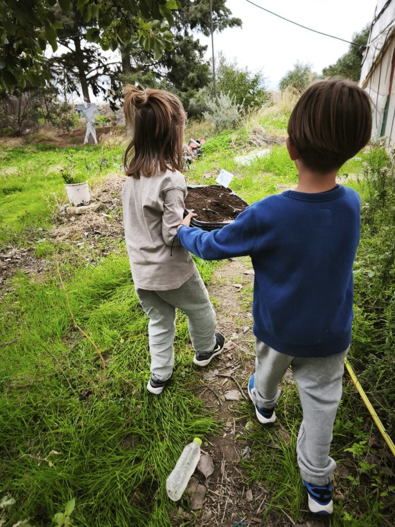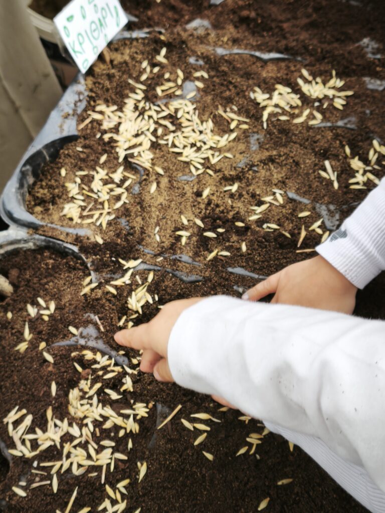 Οι μικροί μας επιστήμονες με τις δασκάλες τους και τον Πρόεδρό μας , μαθαίνουν να καλλιεργούν διάφορα φυτά της εποχής με σπόρους, να αναγνωρίζουν τους πολύτιμους σπόρους των φυτών (κριθάρι, σιτάρι, καλαμπόκι, φακή, φασόλια, ..) ,να φτιάχνουν κατάλληλα μείγματα, για να φυτέψουν τους σπόρους (φυτόχωμα, άμμο και περλίτη) και τέλος να ασχολούνται με τη σπορά των σπόρων. Οι μικροί μας φίλοι, με ιδιαίτερη προσοχή μεταφέρουν τις πλαστικές πρασιές με τους σπόρους, μέσα στο θερμοκήπιο και τέλος ραντίζουν τις πρασιές με νερό . Όλα είναι έτοιμα. Η σπορά ολοκληρώθηκε.
