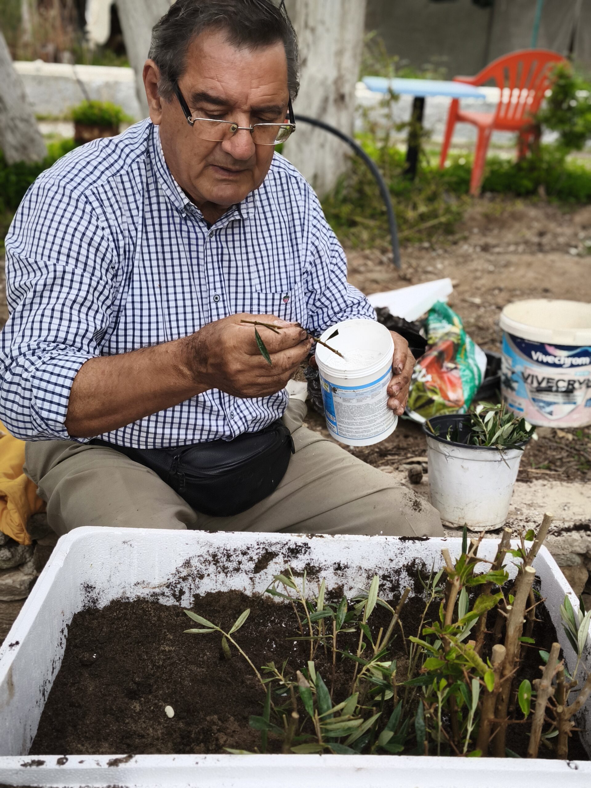 Με άψογη συμπεριφορά και συνεργασία μεταξύ τους και τον Πρόεδρό μας, εκπαιδευτικό, αρχικά δημιούργησαν μείγμα κατάλληλο για να φυτευτούν φυτά, ( φυτόχωμα με άμμο, περλίτη και κομπόστ) και γέμισαν με το παραπάνω μείγμα μικρές πρασιές από φελιζόλ . Ακολούθως χρησιμοποίησαν μικρά νεαρά κλαδιά μήκους 15-20εκ. από (πικροδάφνη), τα οποία μετά από εμποτισμό στην κάτω άκρη τους με φυτοορμόνη ριζοβολίας , τα φύτεψαν (βύθισαν) κατά τα δυο/τρίτα, μέσα στο μείγμα σε σειρές και στήλες και τα πότισαν,.