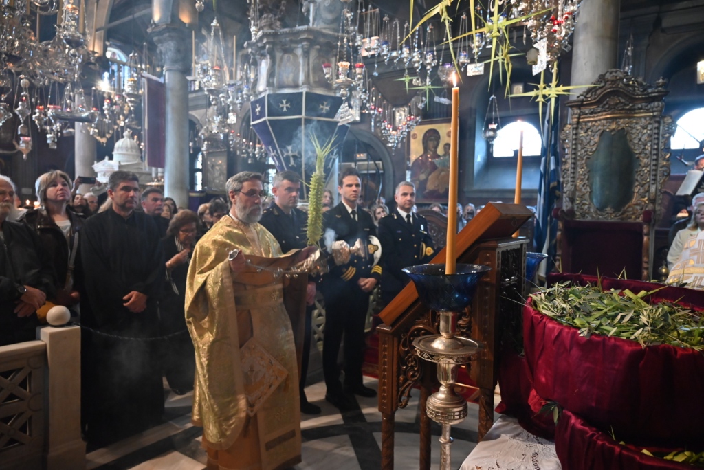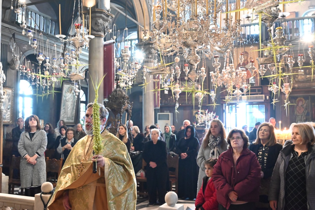 Με την ευλογία του Σεβασμιωτάτου Μητροπολίτου Σύρου-Τήνου κ. Δωροθέου Β’ τελέσθηκε σήμερα στον Πανίερο Ναό της Ευαγγελιστρίας Τήνου, ο Όρθρος και η Θεία Λειτουργία επί τη εορτή της εις Ιερουσαλήμ εισόδου του Κυρίου ημών Ιησού Χριστού, ο οποίος ήταν καταστόλιστος από σταυροειδή παραδοσιακά Βάγια, που κατά το τοπικό έθιμο, αποσπούν οι πιστοί από τους πολυελαίους και τις κανδήλες, εκ των οποίων επικρέμανται, κατά την ανάγνωση της Ευαγγελικής φράσεως “καί έλαβον τα βάϊα των φοινίκων”.