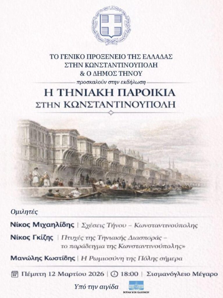Το Γενικό Προξενείο της Ελλάδας στην Κωνσταντινούπολη και ο Δήμος Τήνου σας προσκαλούν την Πέμπτη 12 Μαρτίου 2026, στις 18:00, στο Σισμανόγλειο Μέγαρο.