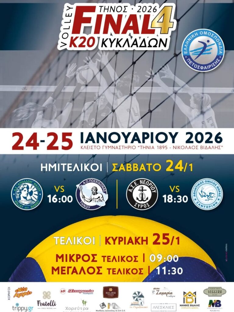 Η Τήνος θα φιλοξενήσει το Final 4 Κ20 Κυκλάδων στο βόλεϊ, με τους αγώνες να διεξάγονται το Σάββατο 24 και την Κυριακή 25 Ιανουαρίου 2026 στο Κλειστό Γυμναστήριο «Τήνια 1895 – Νικόλαος Βιδάλης».