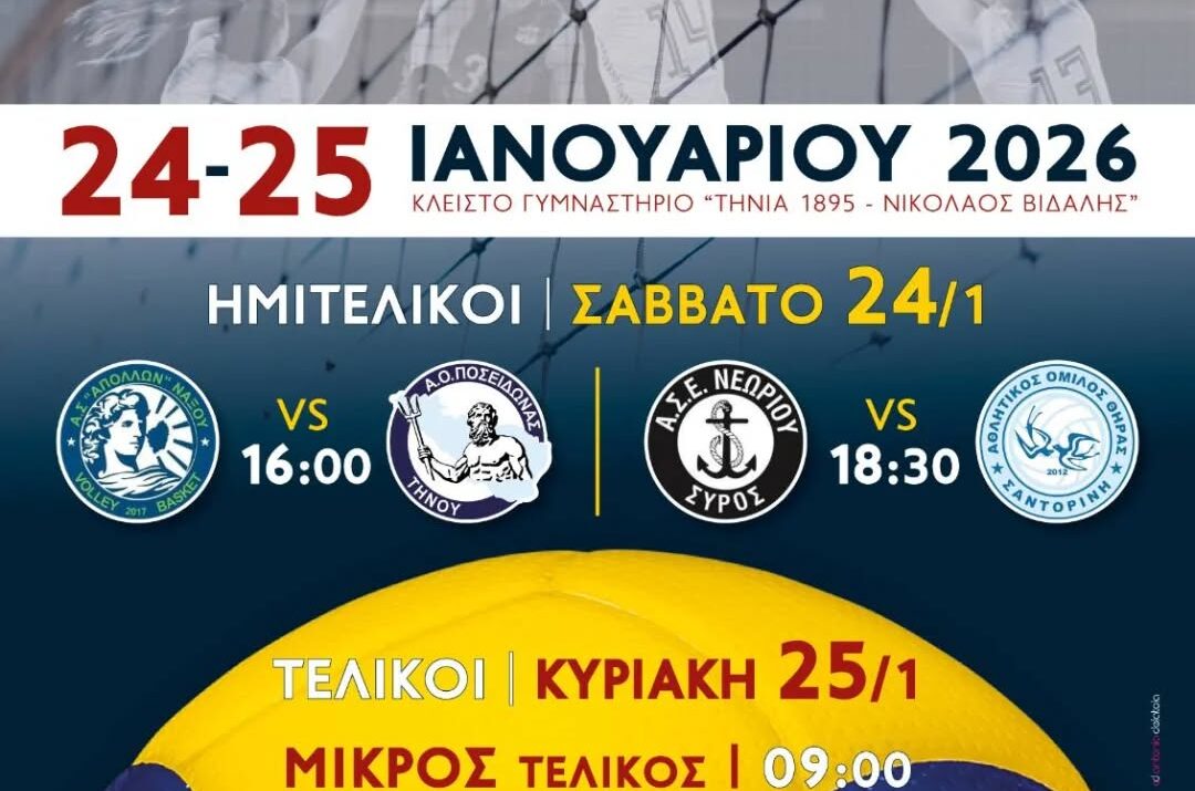 Η Τήνος θα φιλοξενήσει το Final 4 Κ20 Κυκλάδων στο βόλεϊ, με τους αγώνες να διεξάγονται το Σάββατο 24 και την Κυριακή 25 Ιανουαρίου 2026 στο Κλειστό Γυμναστήριο «Τήνια 1895 – Νικόλαος Βιδάλης».