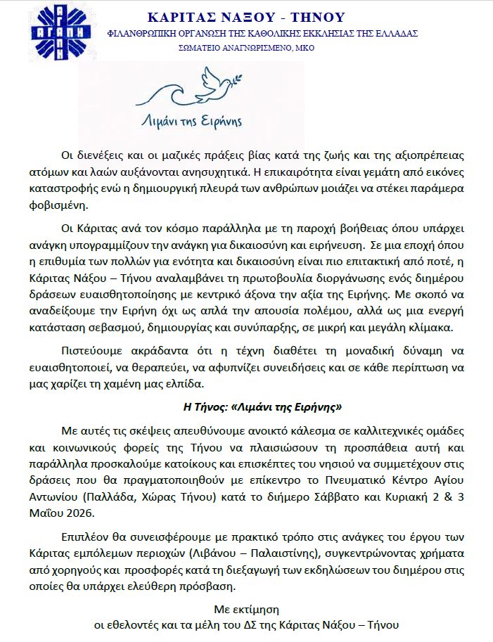 Οι Κάριτας ανά τον κόσμο παράλληλα με την παροχή βοήθειας όπου υπάρχει ανάγκη πυροδοτούν την ανάγκη για δικαιοσύνη και ειρήνη. Σε μια εποχή όπου η επιθυμία των πολλών για ενότητα και δικαιοσύνη είναι πιο επιτακτική από ποτέ, η Κάριτας Νάξου – Τήνου αναλαμβάνει την πρωτοβουλία διοργάνωσης ενός διημέρου δράσεων ευαισθητοποίησης με κεντρικό άξονα την αξία της Ειρήνης. Με σκοπό να αναδείξουμε την Ειρήνη όχι ως απλή την απουσία πολέμου, αλλά ως μια ενεργή κατάσταση σεβασμού, δημιουργίας και συνύπαρξης, σε μικρά και μεγάλα κλίμακα.