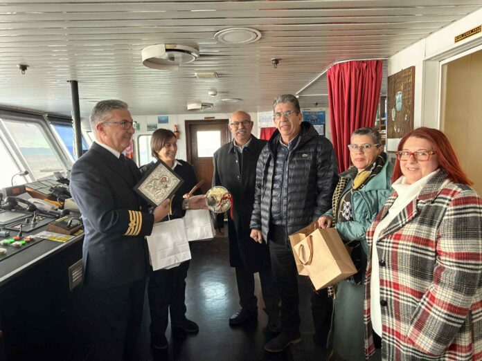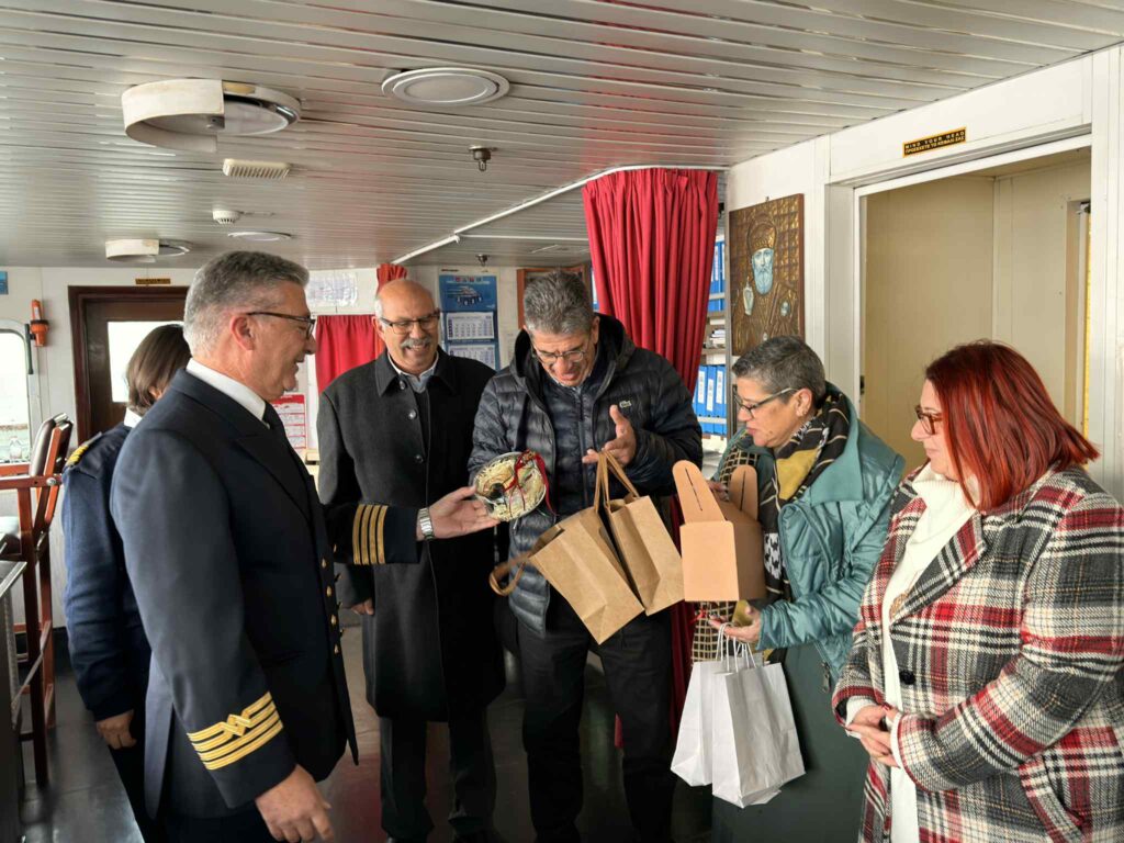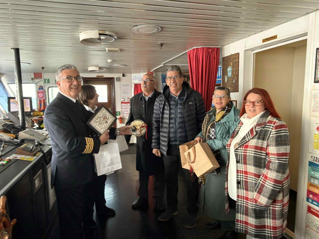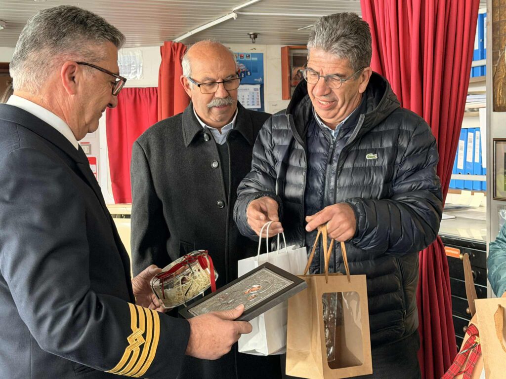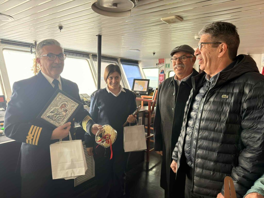 Την άφιξη του πλοίου υποδέχθηκαν εκπρόσωποι του Εμποροεπαγγελματικού και Βιοτεχνικού Συλλόγου Τήνου, με μέλη του Διοικητικού Συμβουλίου να προσφέρουν στον πλοίαρχο κ. Στέλιο Περιστεράκη αναμνηστικά δώρα από το νησί της Τήνου, ως ένδειξη τιμής και φιλοξενίας. Παρών στην υποδοχή ήταν επίσης ο κ. Γιώργος Περπινιάς, εκπροσωπώντας το Λιμενικό Ταμείο Τήνου.