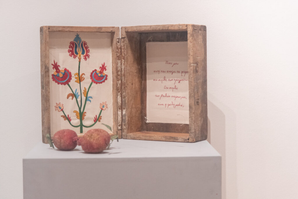 «Τα είκοσι πέντε έργα της έκθεσης, που δημιουργήθηκαν ειδικά για την ενότητα αυτή, πλαισιώνονται από μικρότερα και μεγαλύτερα έργα αντίστοιχης θεματικής, καθώς και από κειμήλια προσωπικών συλλογών. Μαζί συγκροτούν αυτοτελείς εγκαταστάσεις στον εκθεσιακό χώρο, αναπτύσσοντας ένα πολυσχιδές οπτικό και εννοιολογικό αφήγημα.»