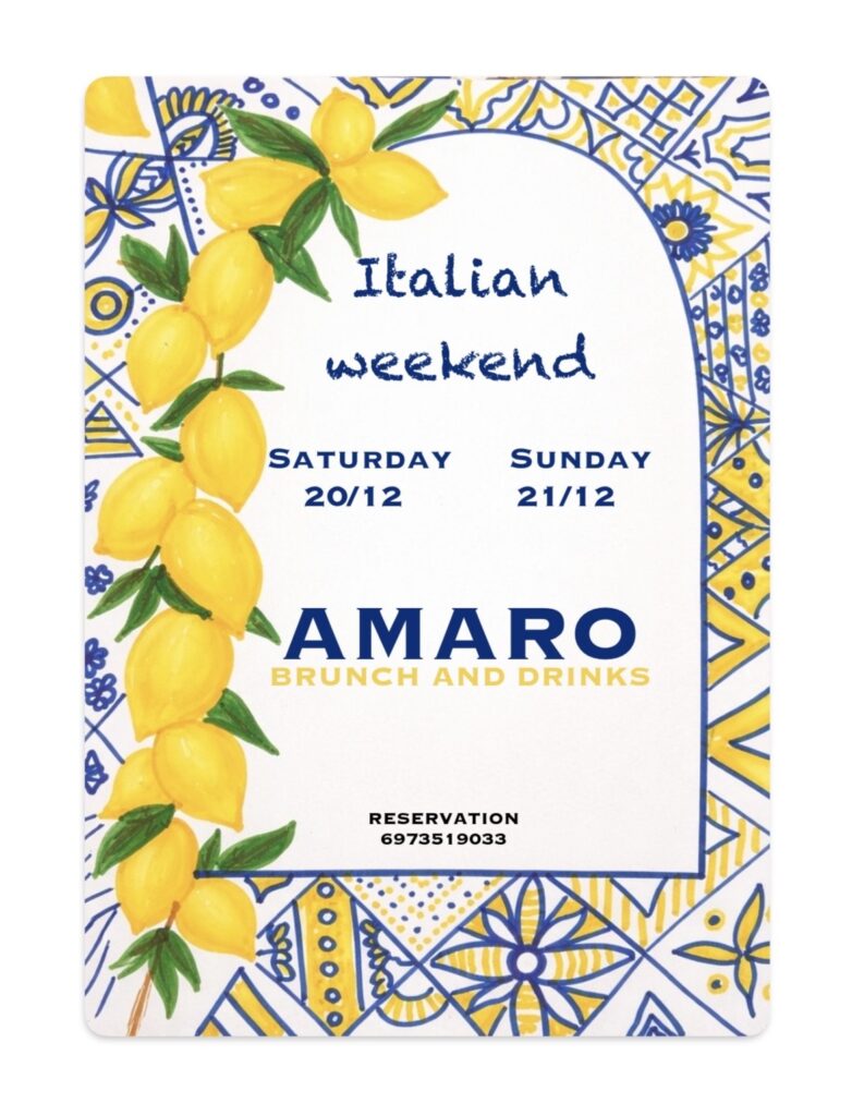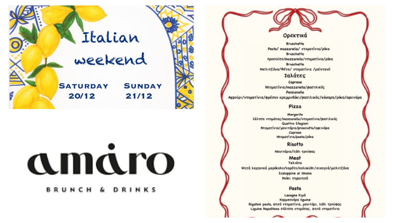 Συνεχίζοντας το ταξίδι στις κουζίνες του κόσμου το Σάββατο 20/12 & την Κυριακή 21/12 το Amaro brunch & drinks κάνει στάση στη γειτονική Ιταλία.