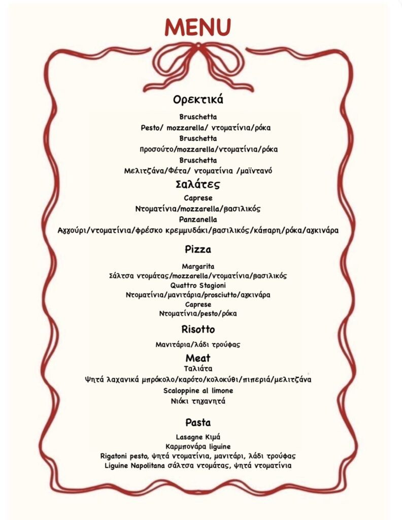 Σας προσκαλούμε σε ένα ξεχωριστό Italian Weekend, αφιερωμένο στην αυθεντική ιταλική κουζίνα και φιλοξενία. Απολαύστε εκλεκτές ιταλικές γεύσεις, εμπνευσμένα πιάτα και μοναδικά αρώματα που θα σας ταξιδέψουν στην καρδιά της Ιταλίας, μέσα από ένα ειδικά διαμορφωμένο μενού.