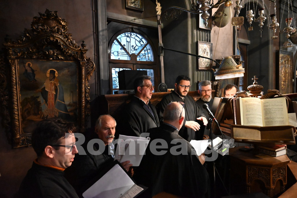 Τους ύμνους απέδωσαν οι χοροί, των ιεροψαλτών στο δεξιό αναλόγιο υπό την διεύθυνση του Πρωτοψάλτη κ. Μάριου Κυριάκου και των Κληρικών της Ιεράς Νήσου υπό τη διεύθυνση του Ιερολ. Αρχιδιακόνου Αντωνίου Τζανουλίνου στο αριστερό.