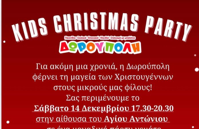 Σας περιμένουμε το Σάββατο 14 Δεκεμβρίου 17:30-20:30 στην αίθουσα του Αγίου Αντωνίου σε ένα μοναδικό πάρτι γεμάτο δραστηριότητες, παιχνίδια, εκπλήξεις και γιορτινή διάθεση!